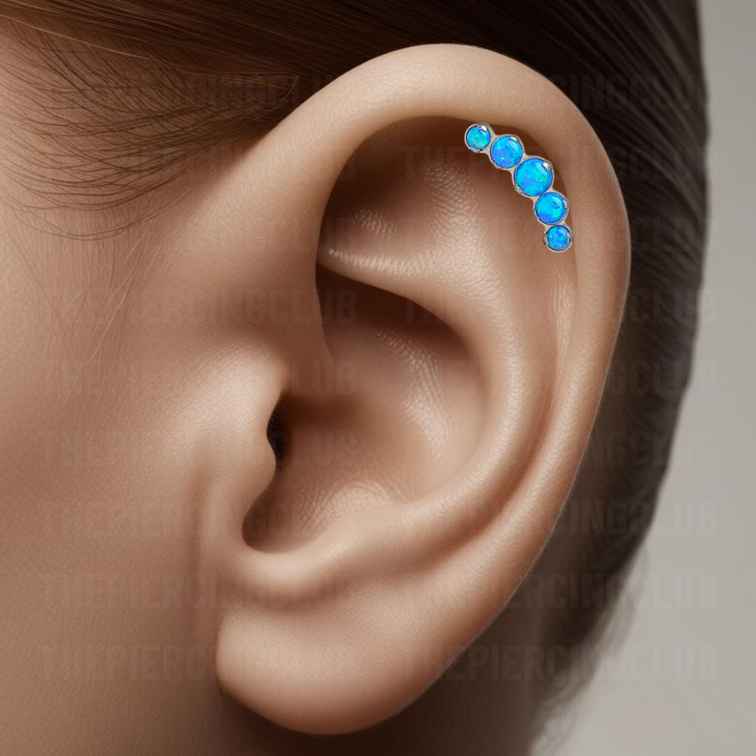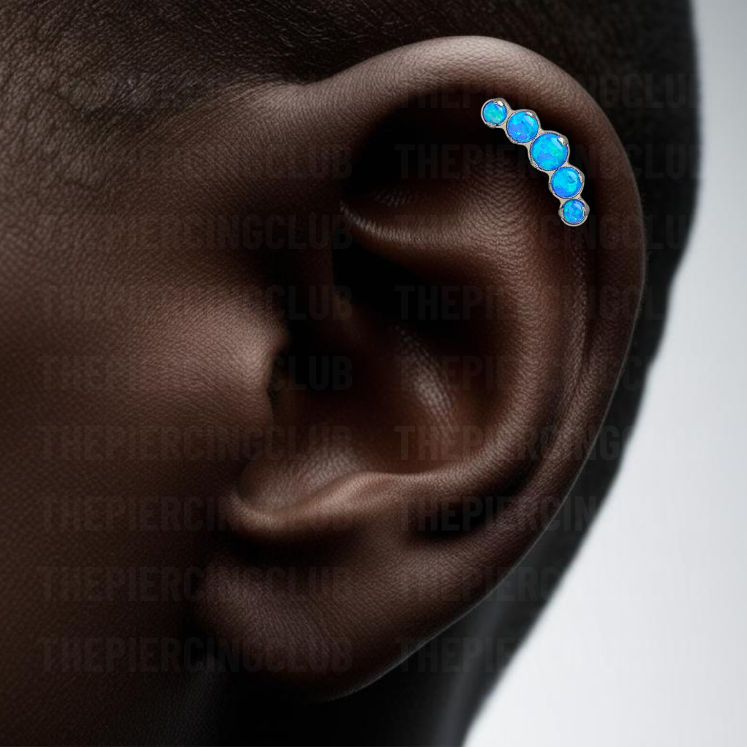 Joya 100% en titanio grado implante con pulido en su superficie pero que realmente la hace especial es su piedra de ópalo azul, hipnótico y profundo, como un cielo estrellado o las aguas de un lago misterioso. Es el detalle perfecto para resaltar tu estilo sin sacrificar el bienestar de tu piel.