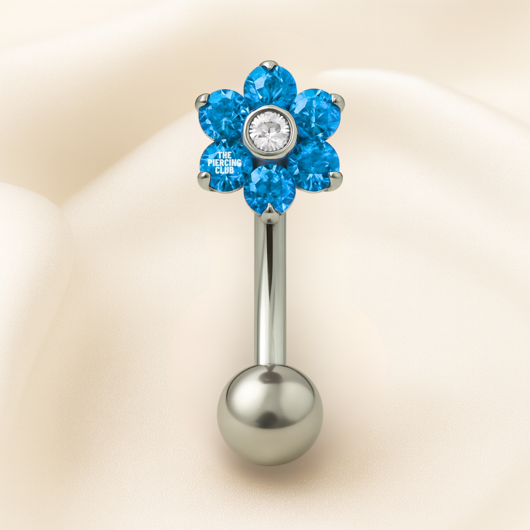 Piercing de ombligo en titanio grado implante, con flor de cristal suizo aguamarina. Si buscas una joya delicada, esta pieza es para ti, se acomoda a cualquier anatomía.