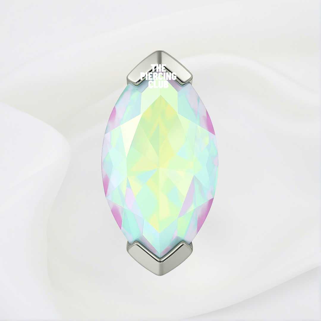 Esta joya de un solo cristal suizo marquesa en tono aurora boreal captura la magia de cada ángulo. En titanio grado implante, se adapta con elegancia a perforaciones como Helix. Su forma alargada estiliza la anatomía, proyectando un brillo suave que parece moverse con tu energía. Perfecta para quienes creen que una sola pieza puede decirlo todo, sin decir demasiado.