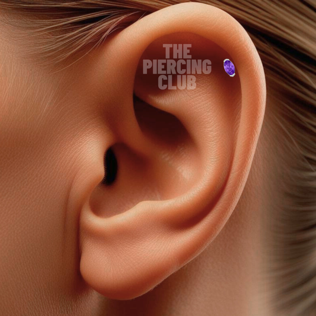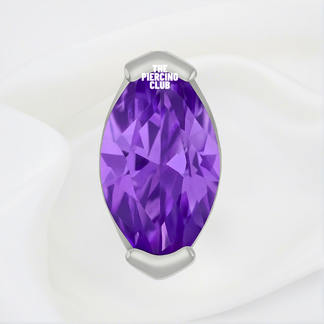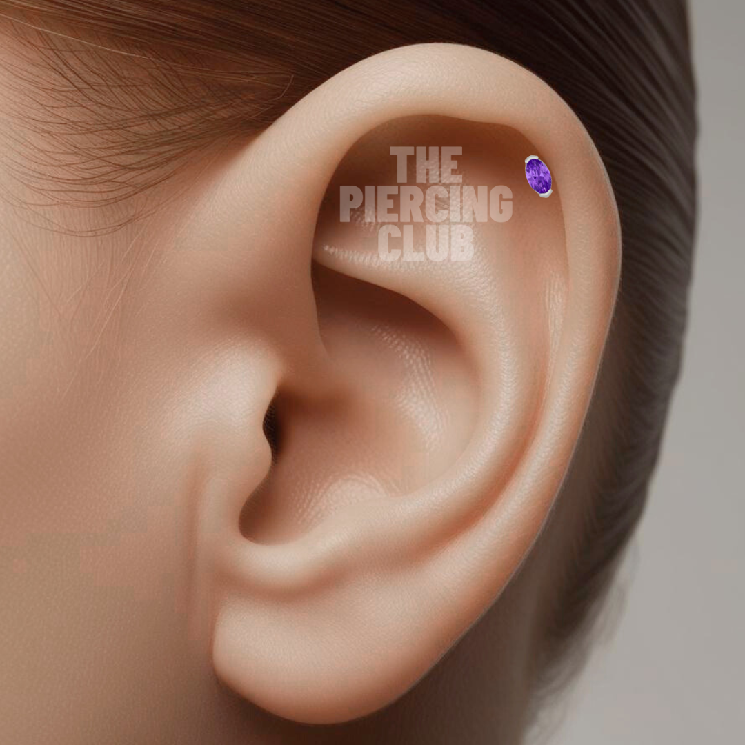 Esta joya de un solo cristal suizo marquesa en tono púrpura captura la magia de cada ángulo. En titanio grado implante, se adapta con elegancia a perforaciones como Helix. Su forma alargada estiliza la anatomía, proyectando un brillo suave que parece moverse con tu energía. Perfecta para quienes creen que una sola pieza puede decirlo todo, sin decir demasiado.