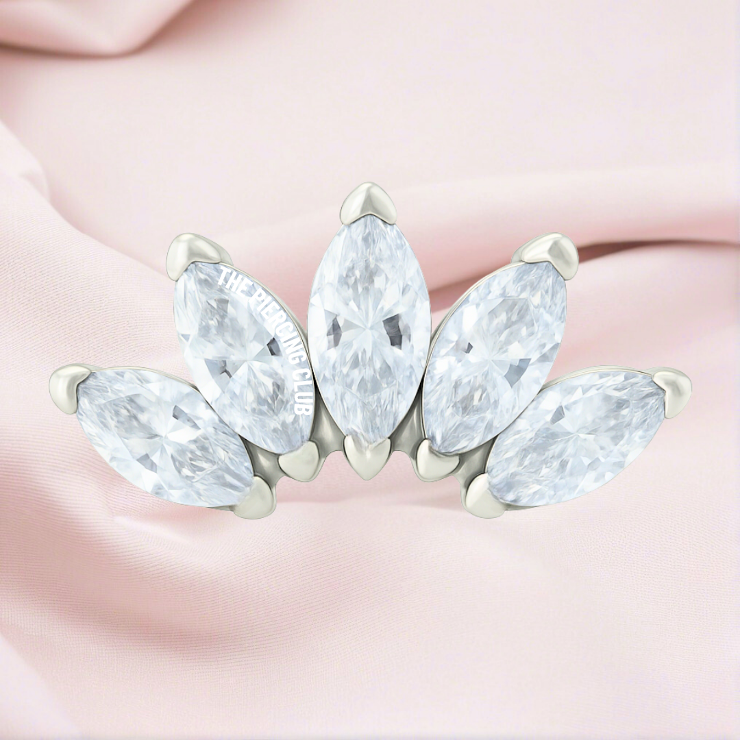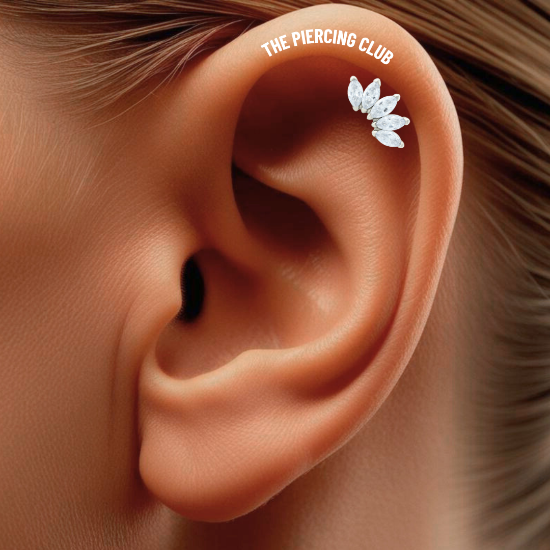 Cinco cristales abrazan casi toda la curva del Helix, convirtiéndolo en una joya llamativa . Es una elección para quienes aman el diseño, desean destacar la oreja completa y buscan una pieza que brille desde todos los ángulos sin necesidad de combinar. Joya 100% en titanio grado implante con pulido en su superficie pero que realmente la hace especial es su cristal suizo blanco, que atrapa la luz de una manera increíble, dándole un brillo sofisticado y elegante. Es el detalle perfecto para resaltar tu estilo sin sacrificar el bienestar de tu piel.