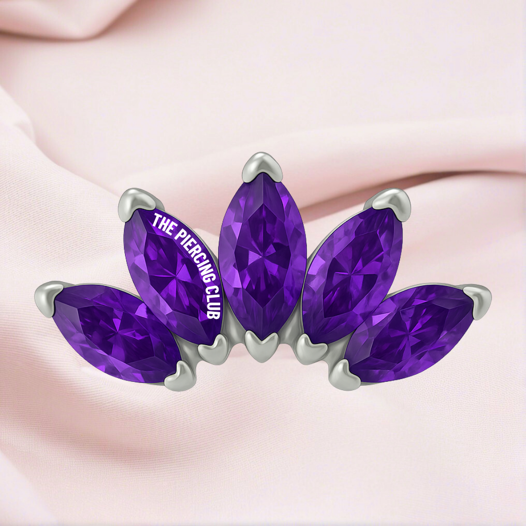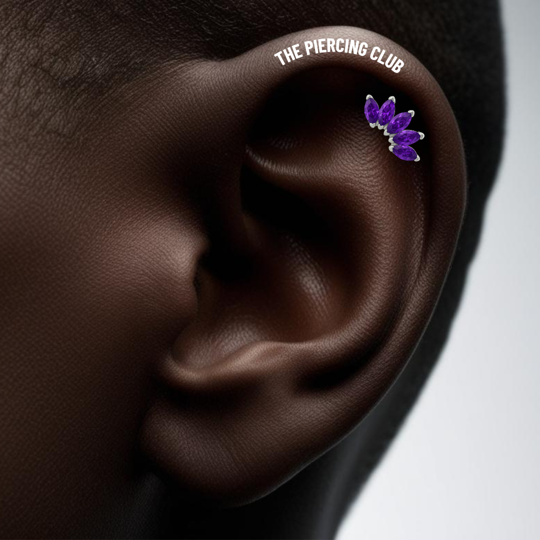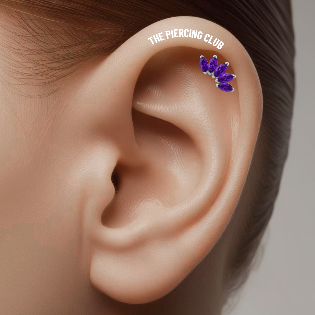 Cinco cristales abrazan casi toda la curva del Helix, convirtiéndolo en una joya llamativa . Es una elección para quienes aman el diseño, desean destacar la oreja completa y buscan una pieza que brille desde todos los ángulos sin necesidad de combinar. Joya 100% en titanio grado implante con pulido en su superficie pero que realmente la hace especial es su cristal suizo púrpura, que atrapa la luz de una manera increíble, dándole un brillo sofisticado y elegante. Es el detalle perfecto para resaltar tu estilo sin sacrificar el bienestar de tu piel.