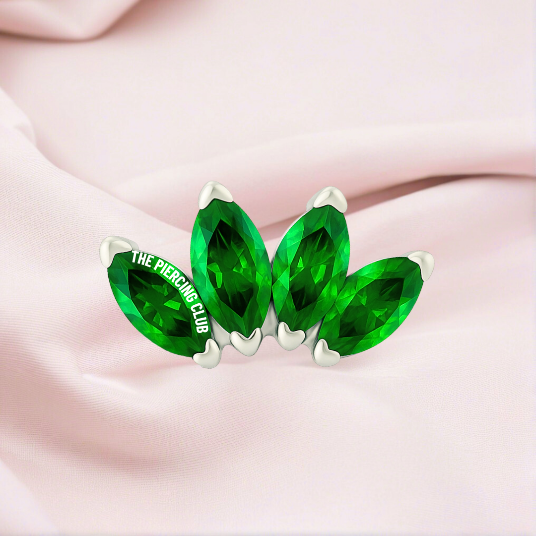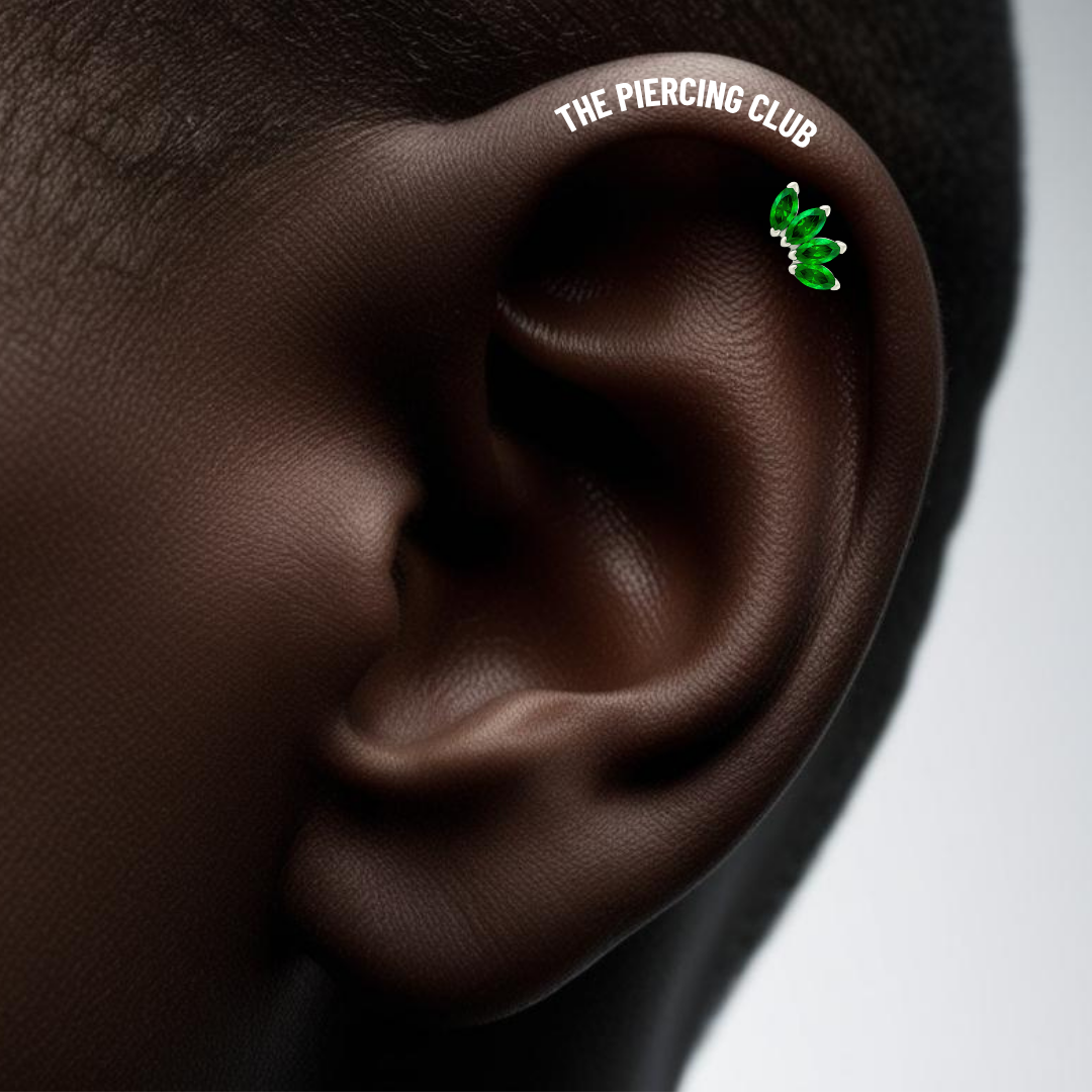 Esta joya de cuatro cristales cubre una porción considerable del Helix, siguiendo su forma como si estuviera hecha a medida. Aporta elegancia con carácter, ideal para quienes quieren una pieza que llene visualmente el cartílago superior sin perder feminidad ni equilibrio. Joya 100% en titanio grado implante con pulido en su superficie + cristal suizo verde esmeralda, que atrapa la luz de una manera increíble, dándole un brillo sofisticado y elegante. Es el detalle perfecto para resaltar tu estilo sin sacrificar el bienestar de tu piel.