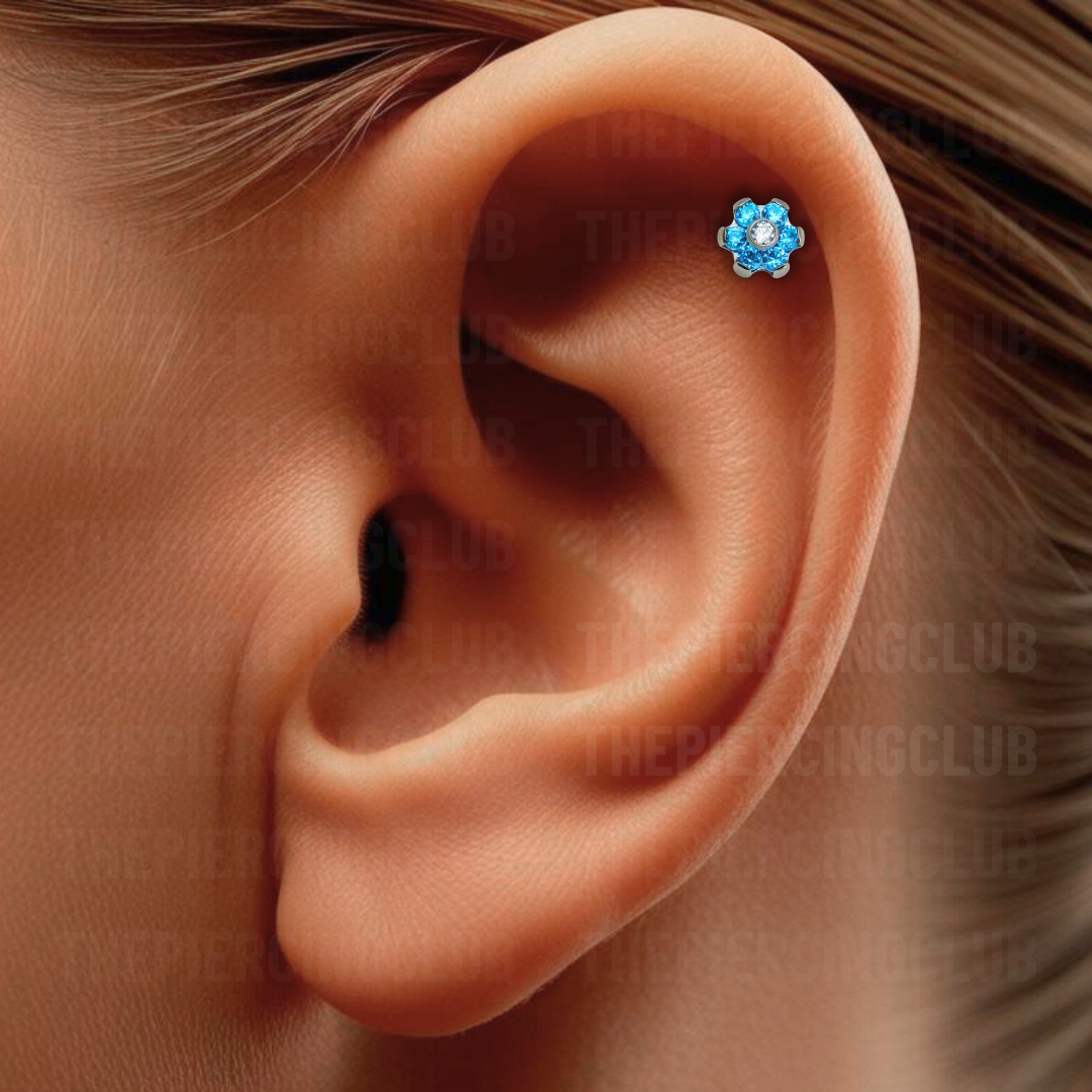 Esta joya en forma de flor, hecha en titanio grado implante y cristales suizos aguamarina, es ese toque sutil que transforma tu Helix en algo especial. Pequeña, luminosa y perfectamente diseñada para acompañarte todos los días. Si buscas algo femenino, seguro y con encanto… esta es la pieza que estabas esperando.